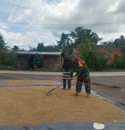 Babinsa Kopka Irvan bersama Bapak Slamet, salah satu petani setempat, bahu membahu menjemur padi di halaman rumah warga. Aktivitas ini juga dilakukan hampir oleh seluruh petani di Desa Gunung Raja untuk menjaga kualitas padi yang telah dipanen agar tetap segar dan tidak cepat membusuk saat disimpan.