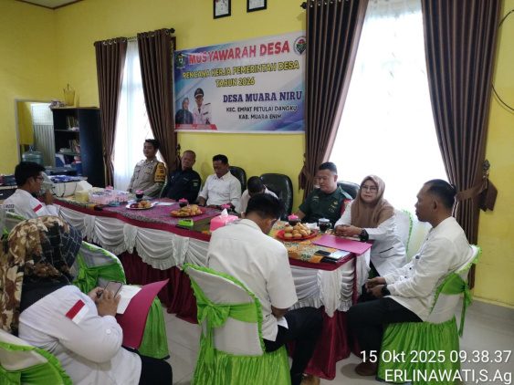 INFOMUARAENIM.COM — Babinsa Koramil 404-04/Gunung Megang Kopda Boby Akbar melaksanakan monitoring kegiatan Musyawarah Desa (Musdes) di Desa Muara Niru, Kecamatan Empat Petulai Dangku, Kabupaten Muara Enim. Kegiatan berlangsung pada Rabu, 15 Oktober 2025 pukul 10.00 WIB s/d selesai, bertempat di Kantor Desa Muara Niru.