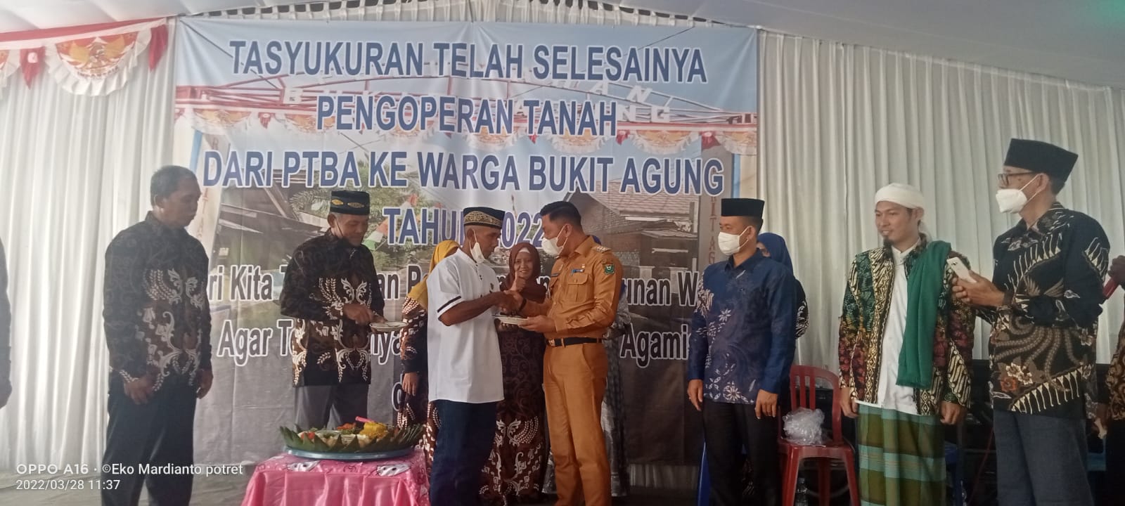 Hal tersebut dikatakan Agus Sukmana selaku ketua tim 17 yang dibentuk pada tahun 2019, dan saat ini warga bukit agung menggelar syukuran dengan memotong 2 ekor sapi karena status tanah sudah jelas dan sudah diserahkan oleh Camat Lawang Kidul bersama SM Aset dan Pertanahan PT.BA di Pendopo Kantor Camat Lawang Kidul, tasyakuran tersebut bertempat di Bukit Agung Desa Keban Agung Kecamatan Lawang Kidul Kabupaten Muara Enim. Senin, (28/3/2022).