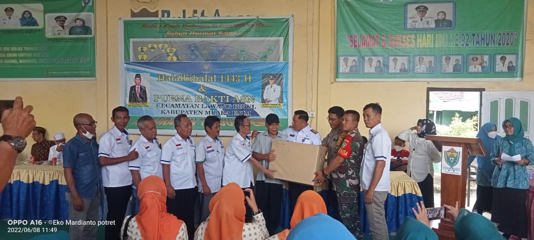 INFOMUARAENIM.COM – Guna mempererat tali silaturahmi antara pemerintah dan masyarakat Kelurahan Tanjung Enim gelar halal bihalal 1443 Hijriyah, dihadiri Camat Lawang Kidul, Management PT. Bukit Asam, kepala UPTD Persampahan, Lurah, Bhabinkamtibmas, Babinsa, TP. PKK, LPMK, Dharma Wanita, Periska BA, Tokoh Adat, tokoh masyarakat, serta Ketua LPMK, sekaligus melepas ASN yang purna bakti pegawai Kecamatan Lawang Kidul dan kelurahan Tanjung Enim, bertempat di balai Kelurahan Tanjung Enim Kecamatan Lawang Kidul Kabupaten Muara Enim. Rabu (08/06/2022).