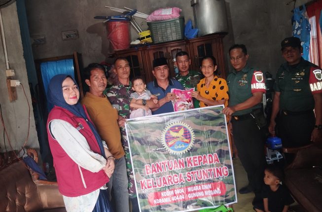 INFOMUARAENIM.COM – Dalam upaya mendukung program percepatan penurunan angka stunting di wilayah Kabupaten Muara Enim, Komando Distrik Militer (Kodim) 0404/Muara Enim melalui Koramil 404-04/Gunung Megang melaksanakan kegiatan pemberian bantuan kepada anak-anak yang terdampak stunting di Desa Pagar Dewa, Kecamatan Benakat, Rabu (25/6/2025) pukul 09.30 WIB.