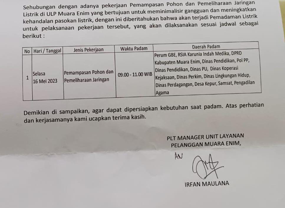 Demikian disampaikan agar dapat dipersiapkan kebutuhan saat padam, atas kerjasama nya kami ucapakan terima kasih,”terang PLT Manager ULP PLN Persero Muara Enim atas nama Irvan Maulana, melalui surat edaran tersebut, pada Selasa (16/05/2023).