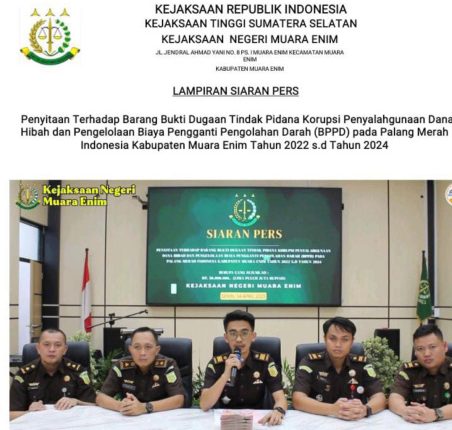 “Barang bukti ini nantinya akan dipergunakan untuk proses selajutnya dalam penanganan perkara dan untuk proses pembuktian di persidangan terhadap dugaan Tindak Pidana Korupsi Penyalahgunaan Dana Hibah dan Pengelolaan Biaya Pengganti Pengolahan Darah (BPPD) pada Palang Merah Indonesia Kabupaten Muara Enim Tahun 2022 s.d Tahun 2024,” pungkas Kajari Muara Enim Rudi Iskandar SH MH melalui Tim penyidik Kejari Muara Enim dalam siaran persnya.(Jj.red).