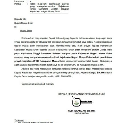 Kepada Yth Bupati Muara Enim di Muara Enim. Berdasarkan penyampaian Bapak Jaksa Agung Republik Indonesia dalam kunjungan kerja virtual pada tanggal 28 Februari 2025 berkaitan dengan hal tersebut saya selaku Kepala Kejaksaan Negeri Muara Enim menyatakan tidak minta -minta atau main proyek kepada Pemerintah Kabupaten Muara Enim beserta jajaran. Selanjutnya untuk tidak melayani oknum Jaksa baik pada Kejaksaan Tinggi Sumatera Selatan maupun pada Kejaksaan Negeri (Kajari) Muara Enim, ataupun yang mengatasnamakan Institusi Kejaksaan Negeri Muara Enim terkait permintaan proyek kegiatan APBD Kabupaten Muara Enim karena hal tersebut tidak benar .