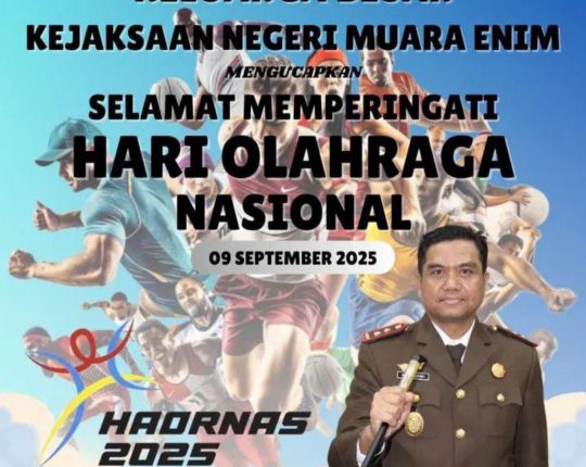 Melalui Hari Olahraga Nasional (Haornas) pada Tanggal 9 September 2025 ini, Keluarga Besar Kejaksaan Negeri Muara Enim mengucapkan, Selamat Memperingati Hari Olahraga Nasional Nasional (Haornas) Tahun 2025 “Olahraga Satukan Kita ,” ucap Kepala Kejaksaan Negeri Muara Enim Zulfahmi SH MH, Senin (09/09/2025).(jj.red).