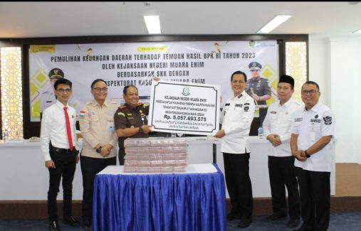 Kejaksaan Negeri Muara Enim melalui Seksi Perdata dan Tata Usaha Negara Kejaksaan Negeri Muara Enim, sejak sekitar bulan januari 2025 hingga saat ini, berhasil memulihkan uang sebesar Rp. 5.056.693.575,- (lima milyar lima puluh enam juta enam ratus sembilan puluh tiga lima ratus tujuh puluh lima rupiah) dari hasil temuan Audit BPK RI perwakilan Sumatera Selatan dengan nilai temuan total sebesar lebih kurang Rp. 30.000.000.000,- (tiga puluh milyar rupiah).