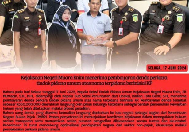 INFOMUARAENIM.COM – Kejaksaan Negeri (Kejari) Muara Enim menerima pembayaran denda perkara tindak pidana umum atas nama terpidana KP. Pembayaran denda tersebut sebesar Rp 50.000.000, yang diserahkan langsung oleh pihak keluarga terpidana sebagai bentuk pemenuhan kewajiban hukum yang telah ditetapkan melalui proses peradilan.
