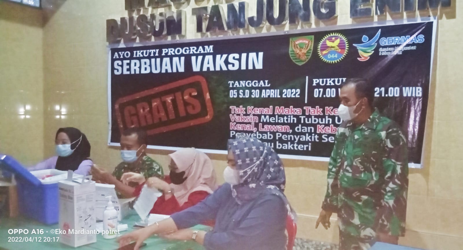 INFOMUARAENIM.COM – Kodim 404 Muara Enim melalui Koramil 404-05 Tanjung Enim program serbuan vaksin dosis 1, 2 dan Booster guna mendukung program pemerintah dalam rangka meningkatkan kekebalan kelompok (herd immunity) masyarakat Tanjung Enim Kecamatan Lawang Kidul Kabupaten Muara Enim. Selasa (12/04)