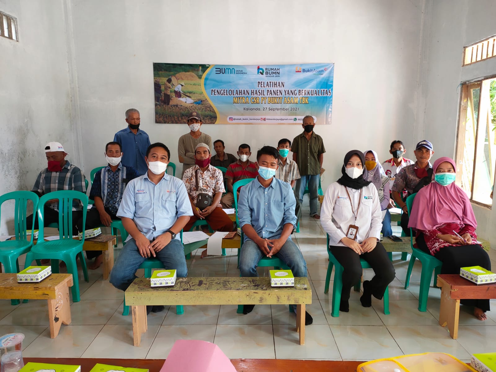 INFOMUARAENIM.COM – Rumah BUMN PT Bukit Asam menggelar pelatihan pengelolaan pasca panen dengan tema “pengelolahan hasil panen yang berkualitas” kepada Petani yang berada di desa Karya Mulyasari, Candipuro, Lampung Selatan, Senin (27/09/2021). Kegiatan ini di ikuti oleh 25 para UMK Binaan dari bidang pertanian.