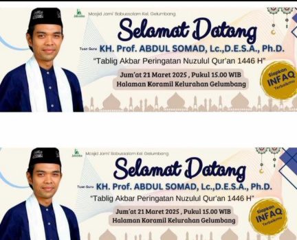 “Insyaallah acara Tablig Akbar melalui peringatan Nuzulul Qur’an yang menghadirkan Ustad Abdul Somad dilaksanakan dihalaman Koramil Kelurahan Gelumbang Kita undang seluruh element masyarakat memperingati Nuzulul Qur’an yang bertepatan dibulan Ramadhan penuh barokah ini,” ucap Ustad Khoirul Imam,SAg.(13/03/2025).